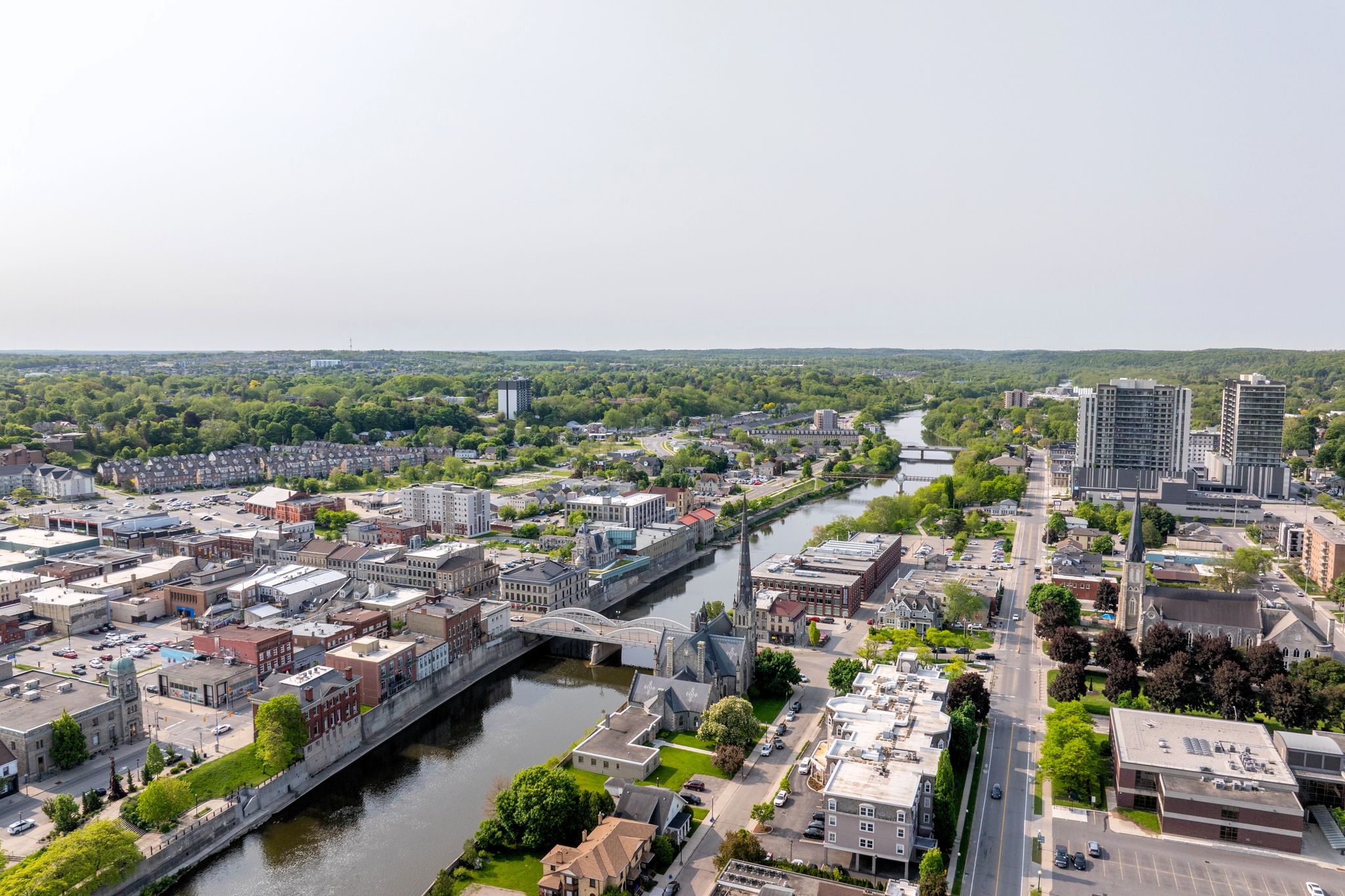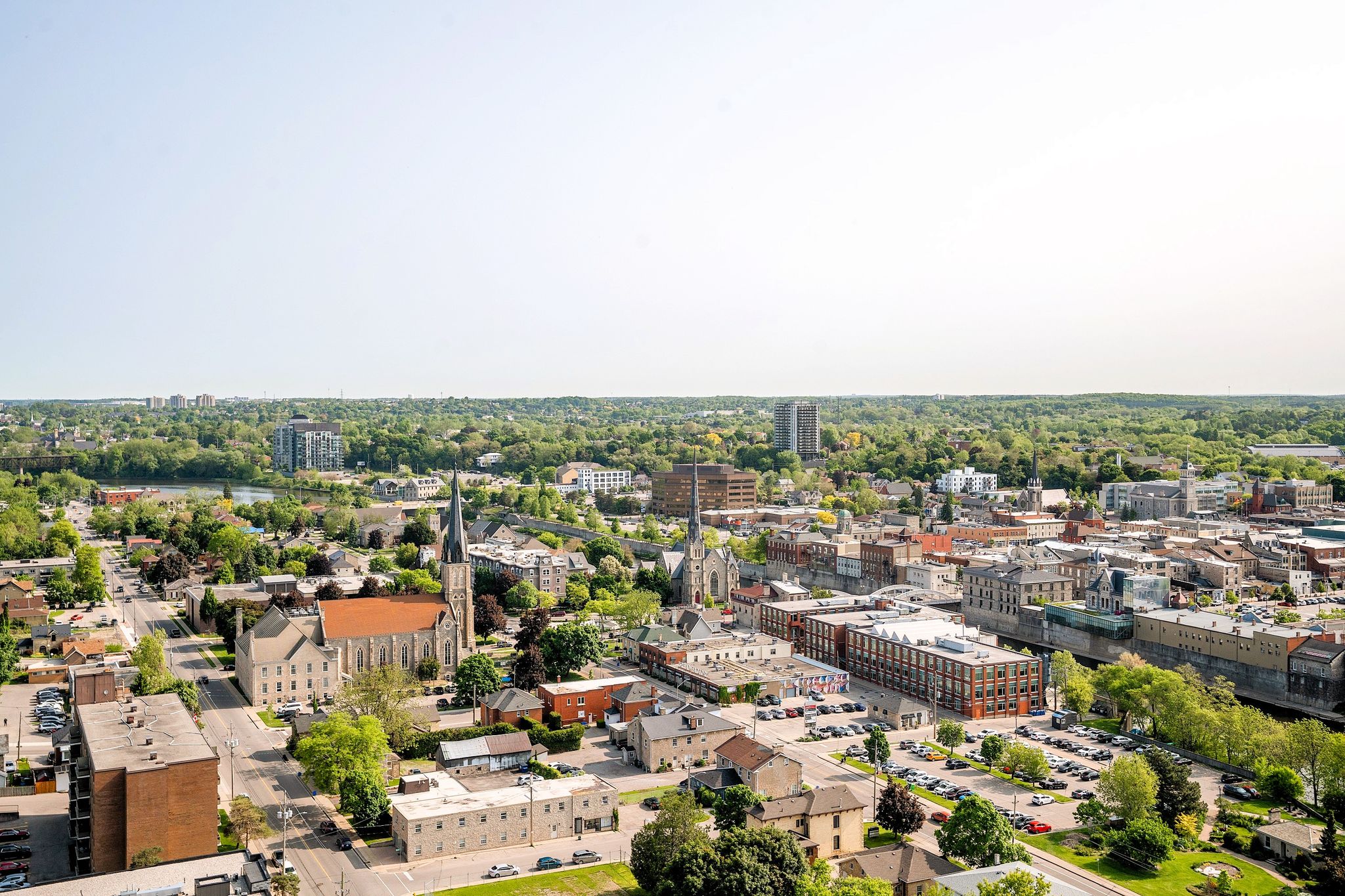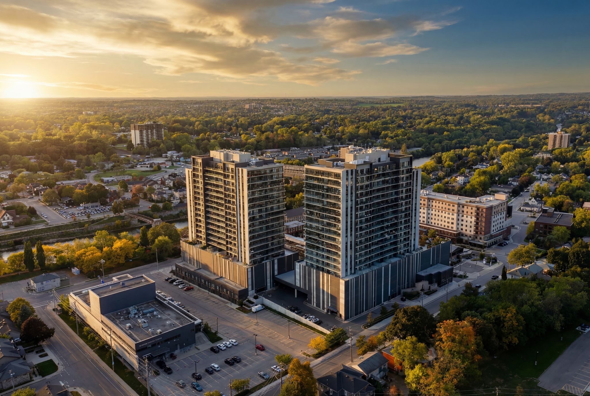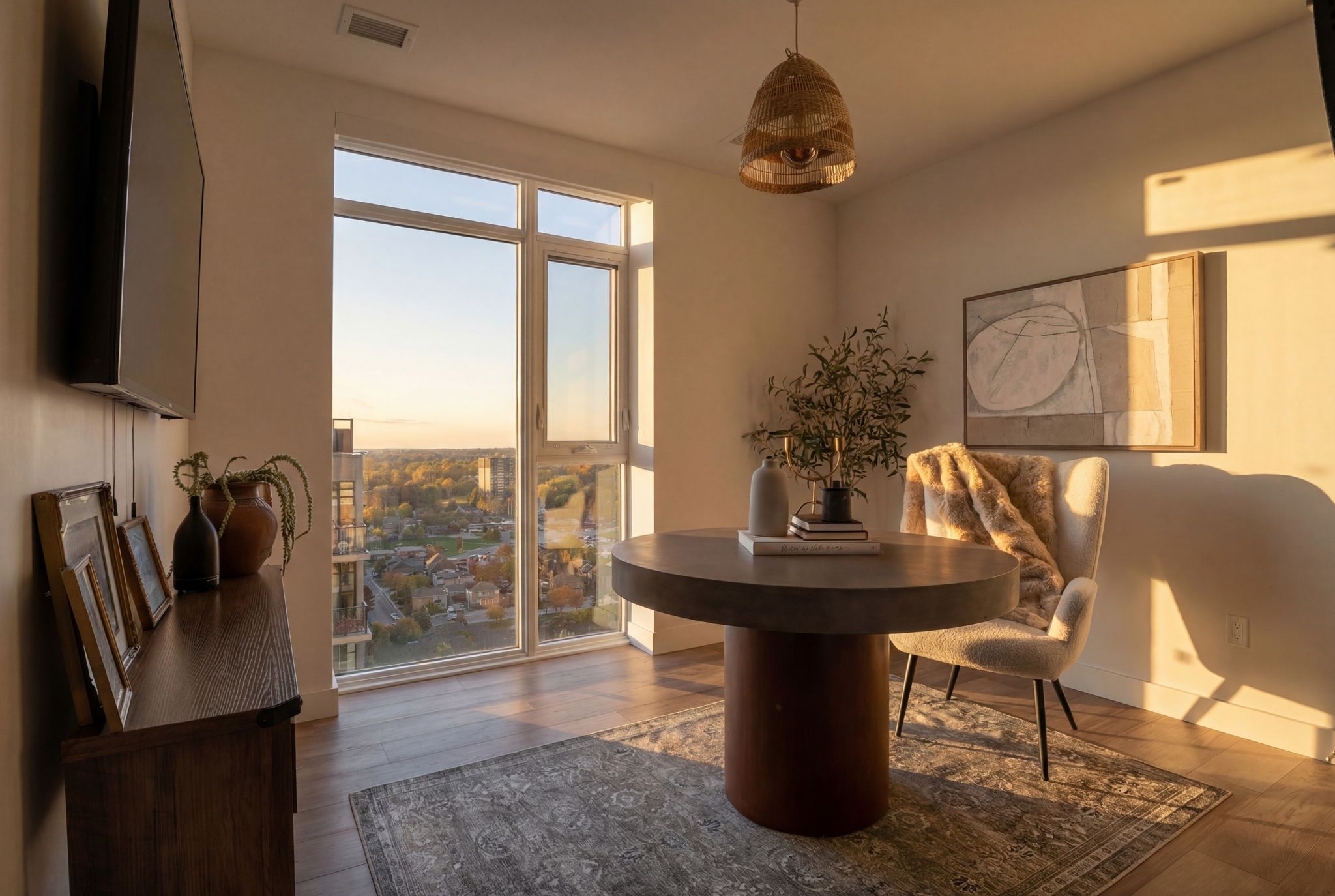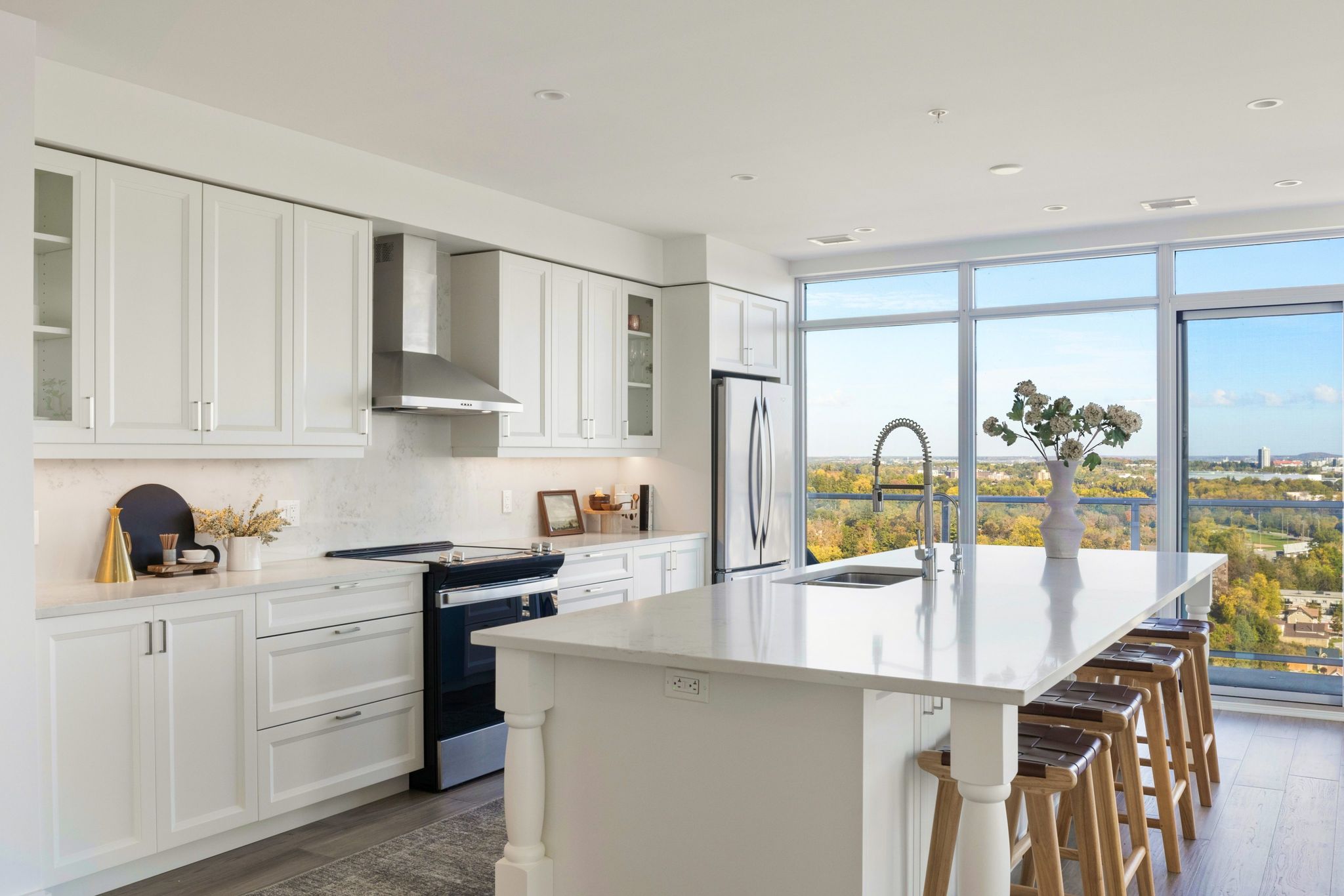 Sunlight pours through walls of glass, framing panoramic views of historic downtown Cambridge and the Grand River. Morning and evening light shifts across the home, creating a calm, airy feel all day. Engineered hardwood runs throughout for a warm, cohesive finish.