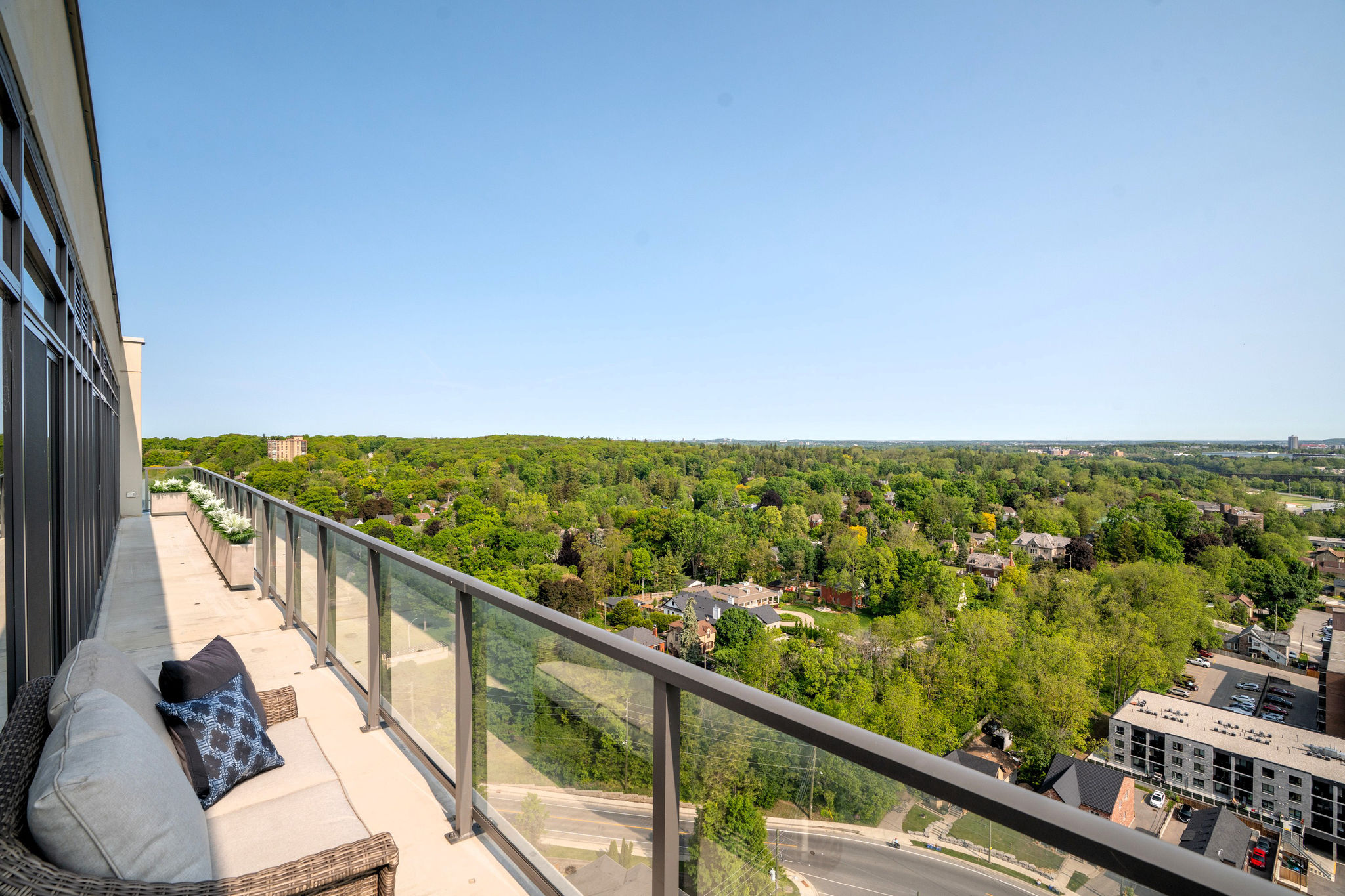 This extraordinary penthouse features a wraparound balcony accessible from every room, offering breathtaking sunrise and sunset views over the city skyline and Grand River.
