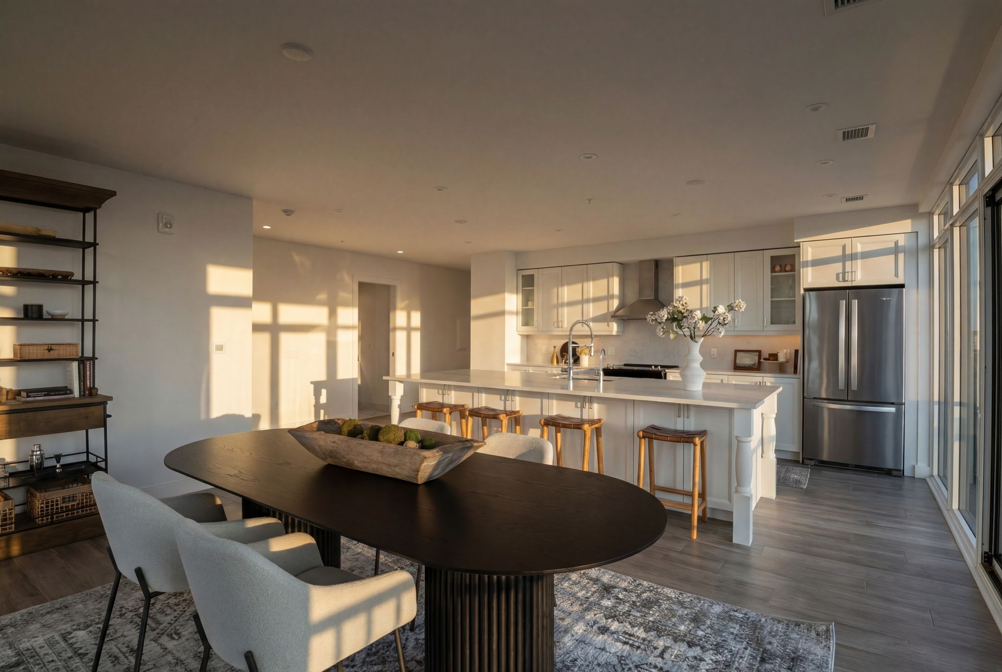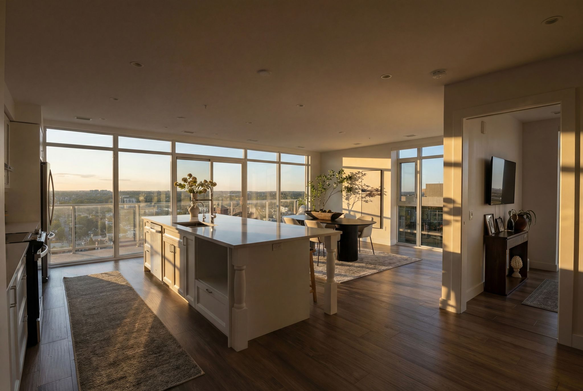 A rare 2,300 sq. ft. penthouse formed by combining two expansive suites, spanning the full side of the building. The result is a true three-bedroom, three-bath residence with a welcoming foyer and an open-concept living, dining, and kitchen core made for effortless hosting.