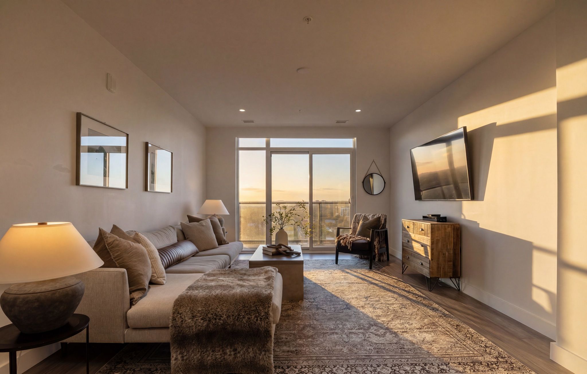 Step inside the foyer that leads into a sun-drenched, open-concept living space. Floor-to-ceiling windows flood the home with natural light, highlighting the warmth and elegance of engineered hardwood flooring throughout. Thoughtfully designed pocket doors in every bedroom maximize both space and functionality.
