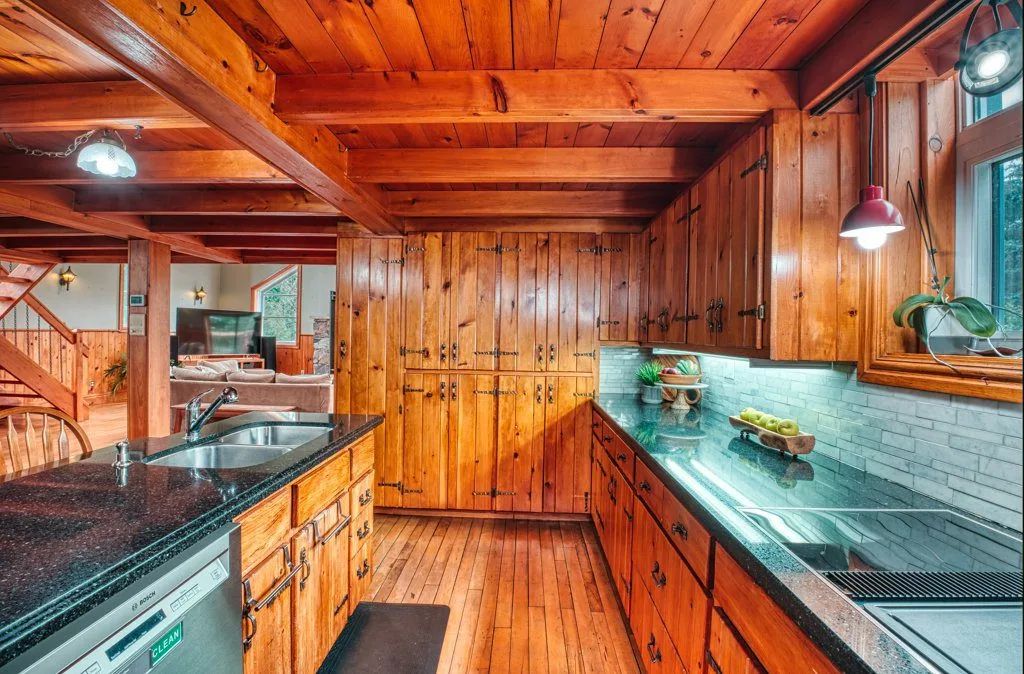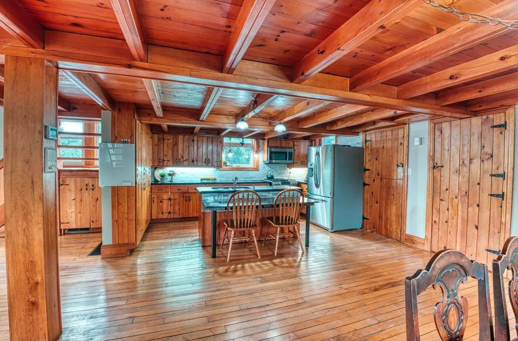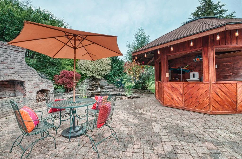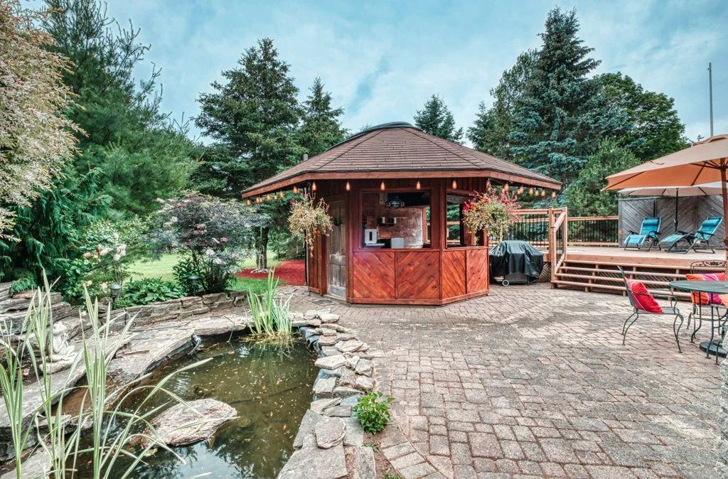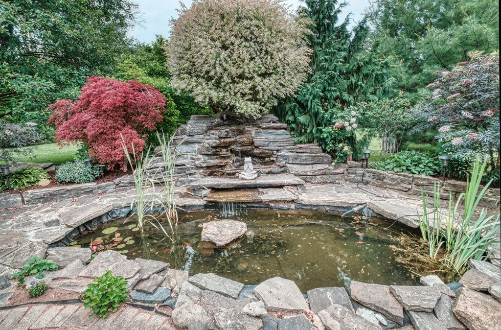 The 1.3-acre lot is an oasis bursting with beautiful mature evergreens, fruit trees and perennial gardens. The salt-water pool, well-equipped cabana includes a wet bar and seating area. Other spa-like features include an outdoor sauna and fishpond and private seating areas which are quite serene and yet wonderful for entertaining large and small groups of family and friends.