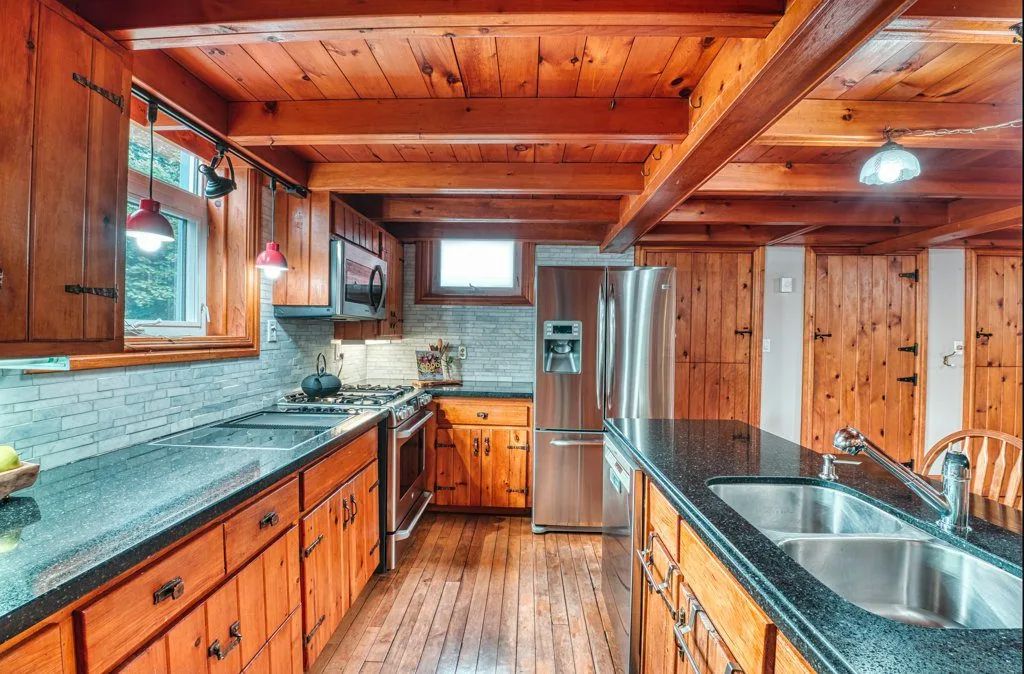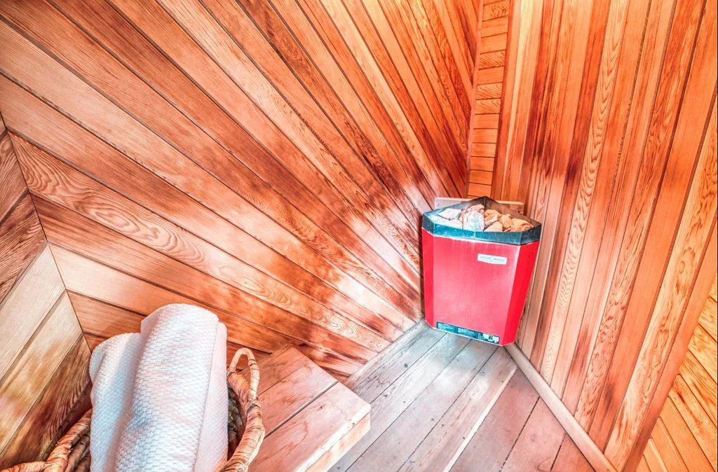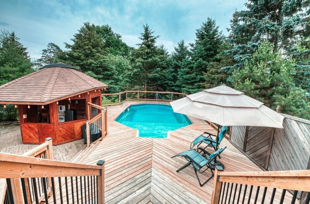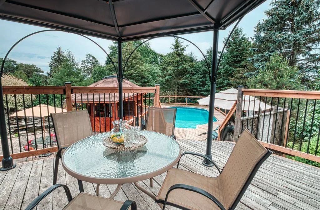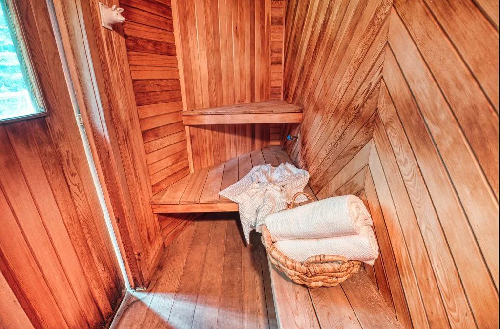 The 1.3-acre lot is an oasis bursting with beautiful mature evergreens, fruit trees and perennial gardens. The salt-water pool, well-equipped cabana includes a wet bar and seating area. Other spa-like features include an outdoor sauna and fishpond and private seating areas which are quite serene and yet wonderful for entertaining large and small groups of family and friends.