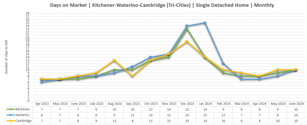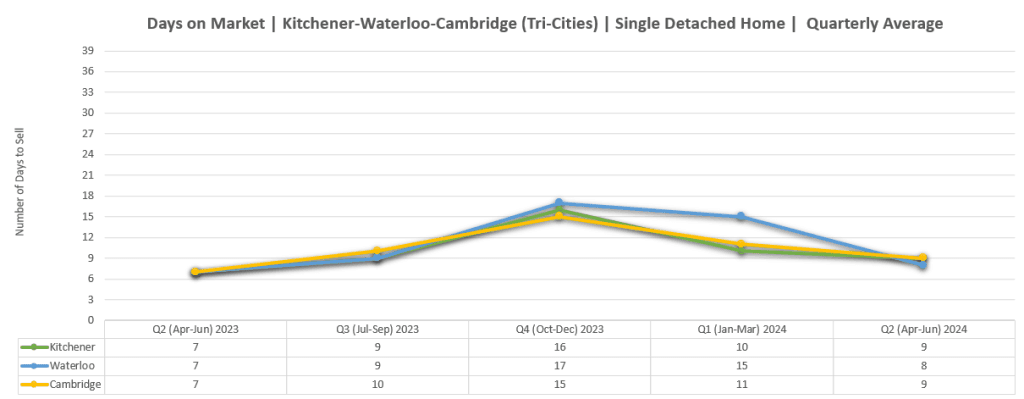 - Detached homes are selling on an average of 9 days in Kitchener. This timeframe is up by 28.6% from Q2 2023.