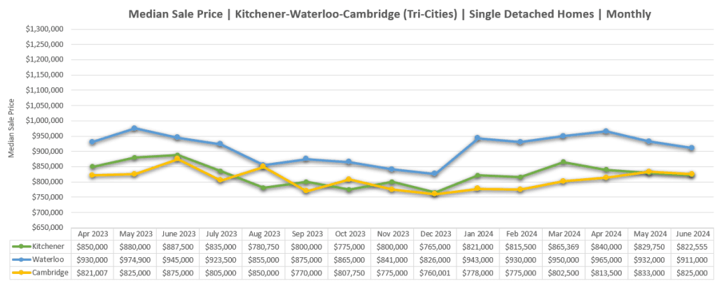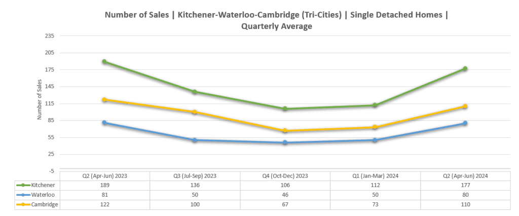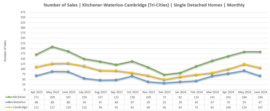 Between April and June of 2024, a total of 1101 single-detached homes were sold in the KW region, marking a slight decrease from the 1179 sales recorded in the same period in 2023. Upon closer examination and breaking down the numbers for each area, it becomes apparent that Kitchener recorded 531 home sales, Waterloo saw 239, and Cambridge experienced 331.