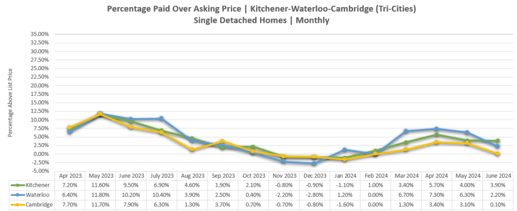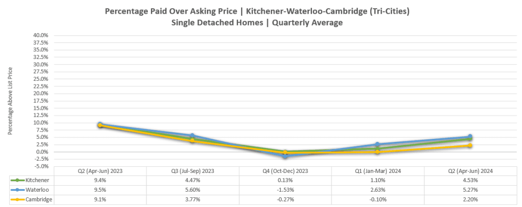 - Waterloo: In Q2 of 2023, buyers paid an average of 9.5% above the asking price. This year, the average premium paid by buyers has decreased to 5.27% below the asking price, representing a 44.4% year-over-year decline.
