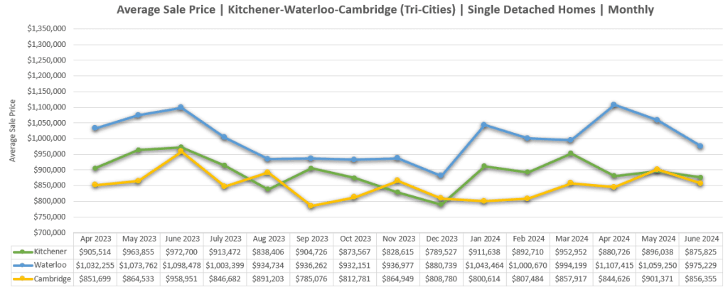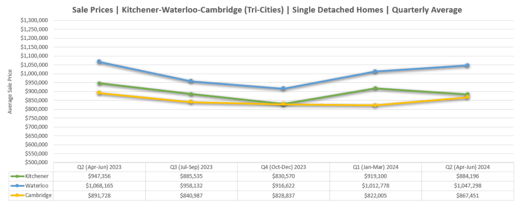 The analysis encompassed both monthly and quarterly data pertaining exclusively to detached homes in the Kitchener, Waterloo, and Cambridge areas. The quarterly graphs depict the average values for each quarter spanning from April 2023 to June 2024.