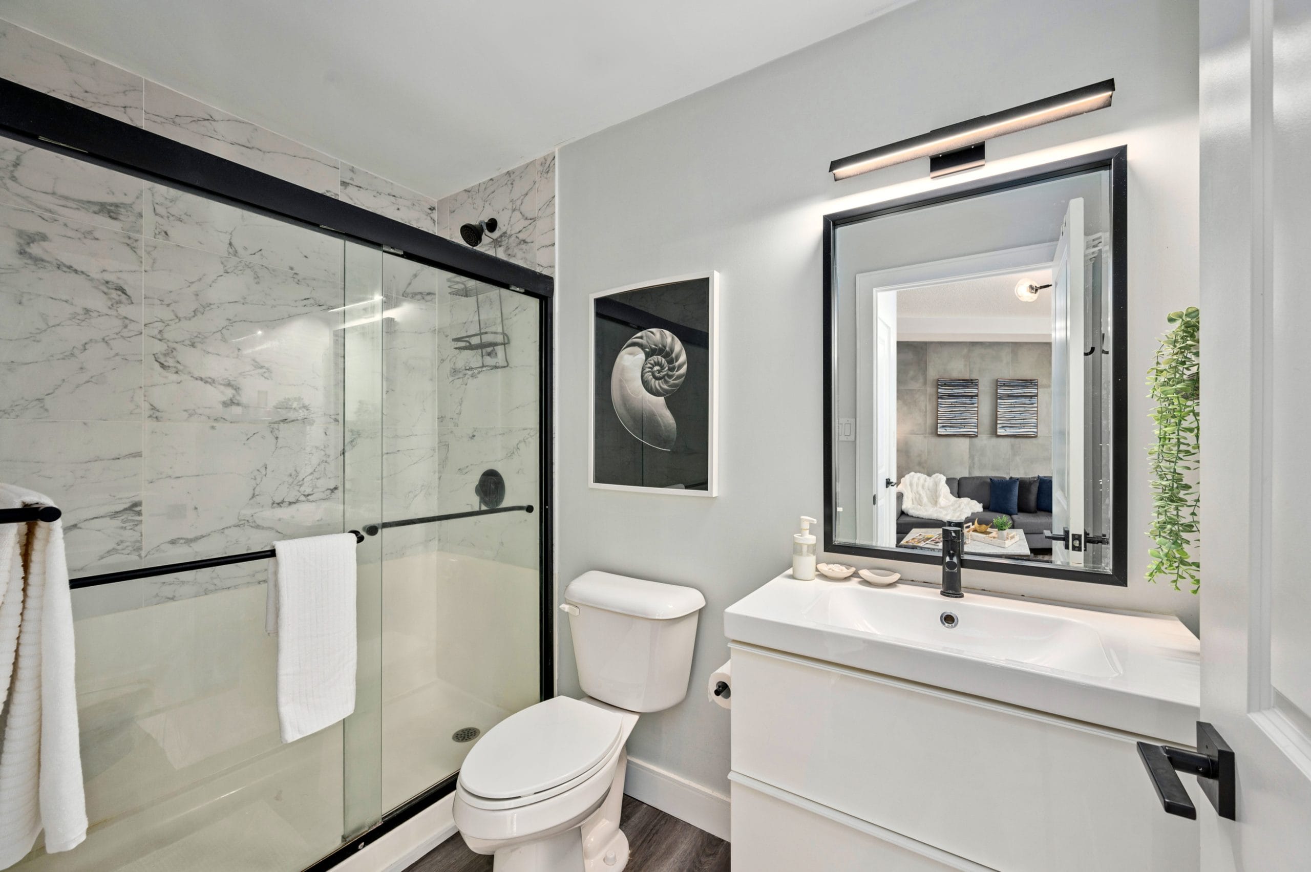 | Interior: | The unit underwent a complete transformation in 2017, showcasing a beautifully updated kitchen with ample cabinetry, a stylish backsplash, stainless steel appliances, and a spacious breakfast bar that seamlessly connects to the living room. Lighting was also completed updated, while the fully remodeled bathroom features modern fixtures, a sleek vanity, elegant wall and shower tiles, upgraded shower doors, and new floor tiles. |