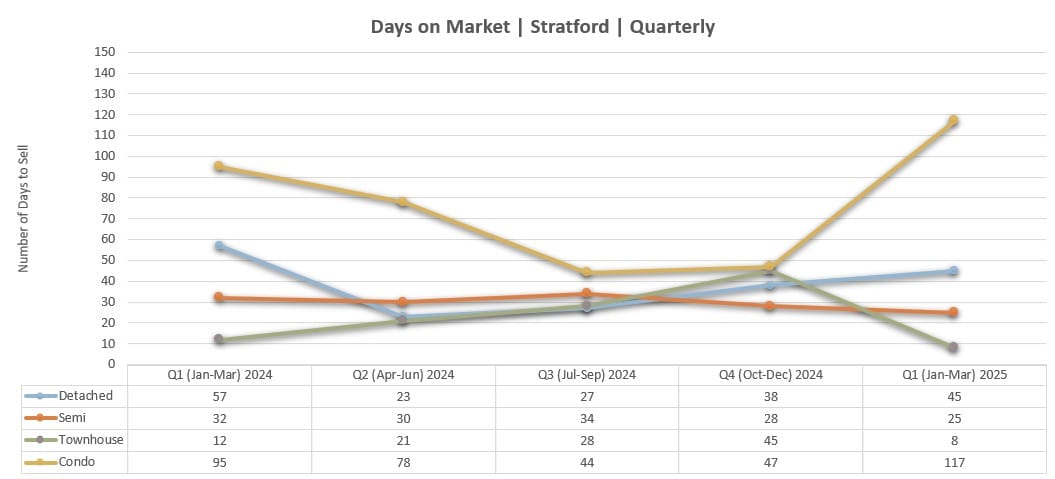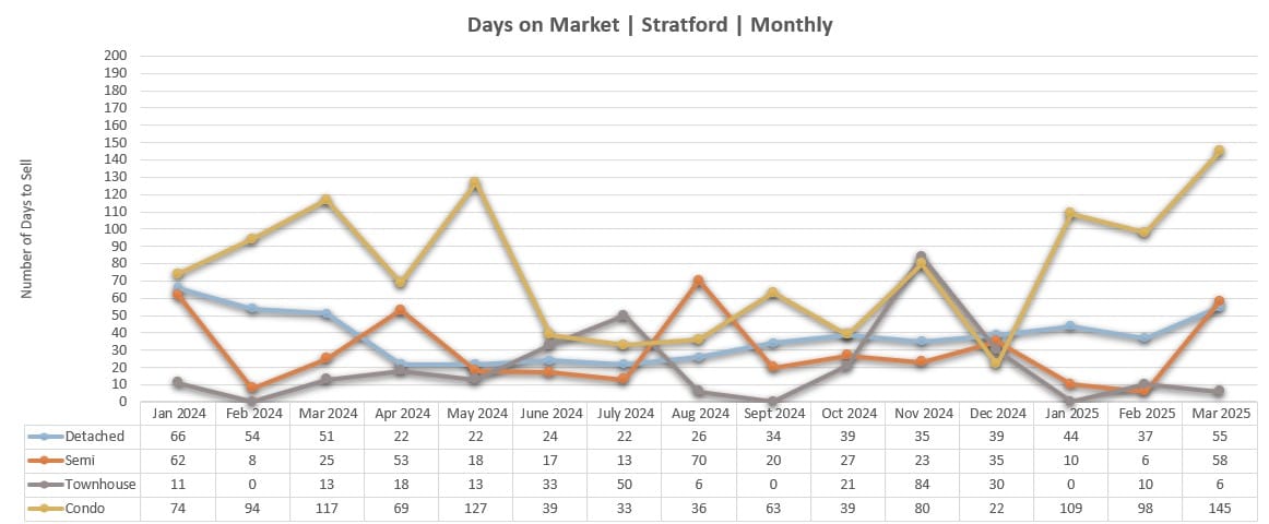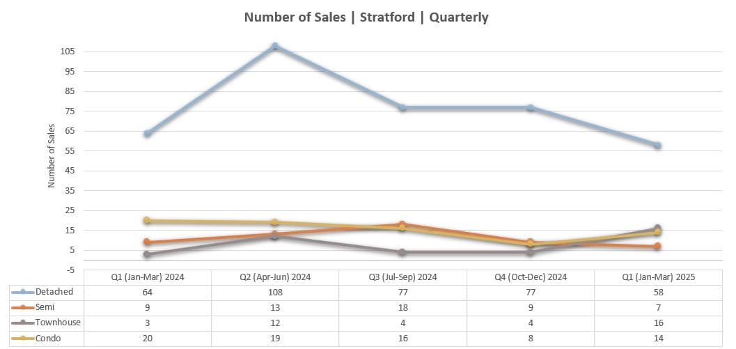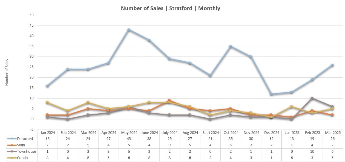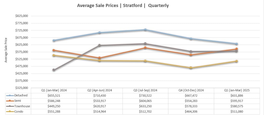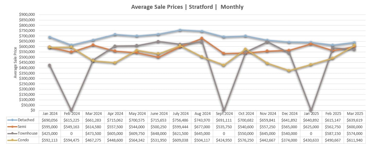 In Q1 2025, average sale prices in most property categories have held steady or rebounded from late-2024 fluctuations. Detached homes remain a consistent pillar of value in Stratford, averaging $639,619 in March 2025, following a dip to $615,147 in February. Semi-detached homes also bounced back to an average of $600,000 in March, up from $562,750 in February.
