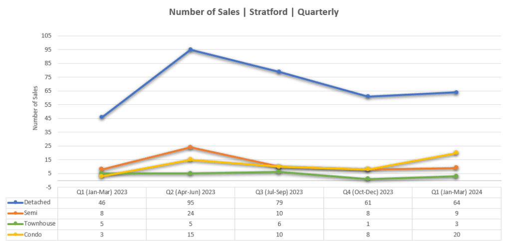 In Stratford, quarterly data is a much more accurate picture of the true market trends, due to the low number of sales in some months.