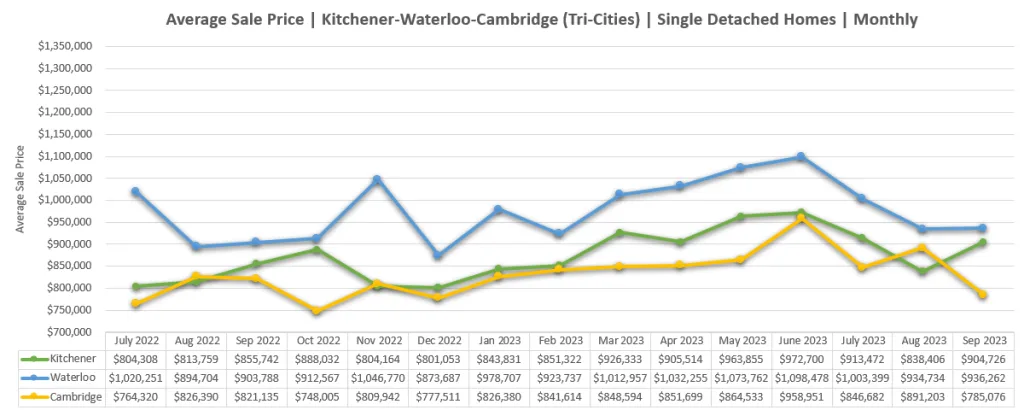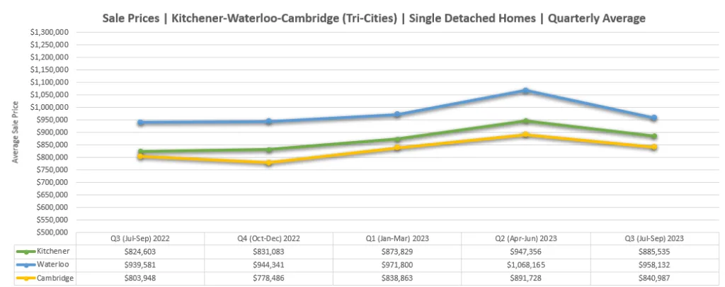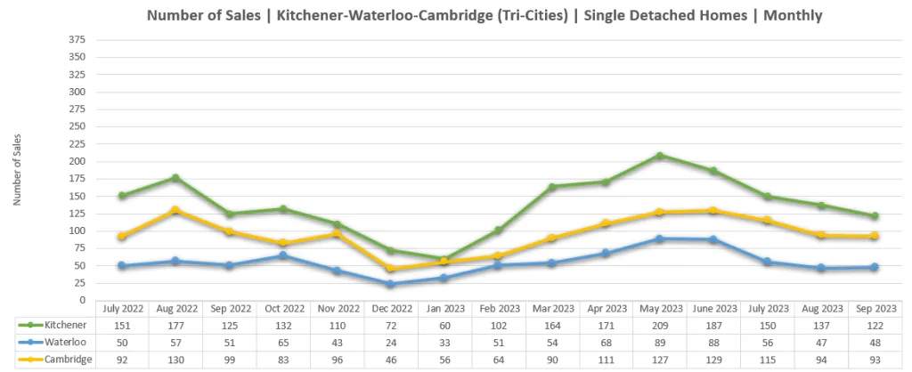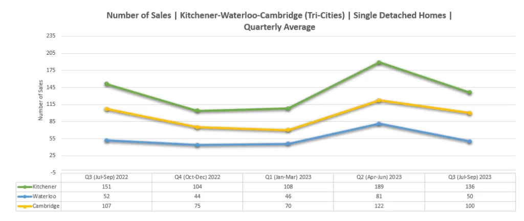 From July to September 2023, there were 862 single-detached homes sold across the Tri-Cities. This figure represents a slight decline from the same period last year when there were 932 total home sales. When we break down the numbers for each area, we find that 409 homes were sold in Kitchener, 151 in Waterloo, and 302 in Cambridge. In all three cities, the number of sales has seen a slight decrease from Q3 2022, although inventory levels have increased.