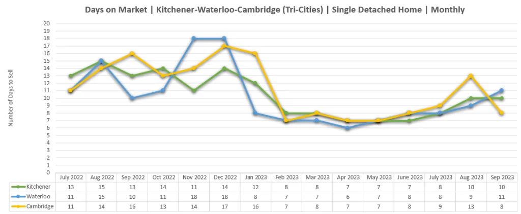 - Detached homes are selling on an average of 10 days in Cambridge. This timeframe is down by 23.1% from Q3 2022.