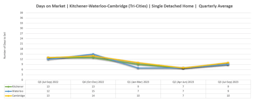 - Detached homes are selling on an average of 9 days in Waterloo. This timeframe is down by 25.0% from Q3 2022.
