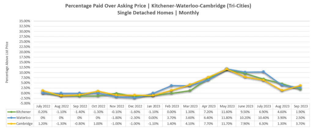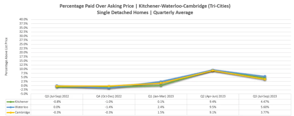 - Kitchener: In Q3 of 2022, buyers paid on average 0.8% less than the asking price, while this year, we are witnessing an increase with buyers paying, on average, 4.47% above the asking price.